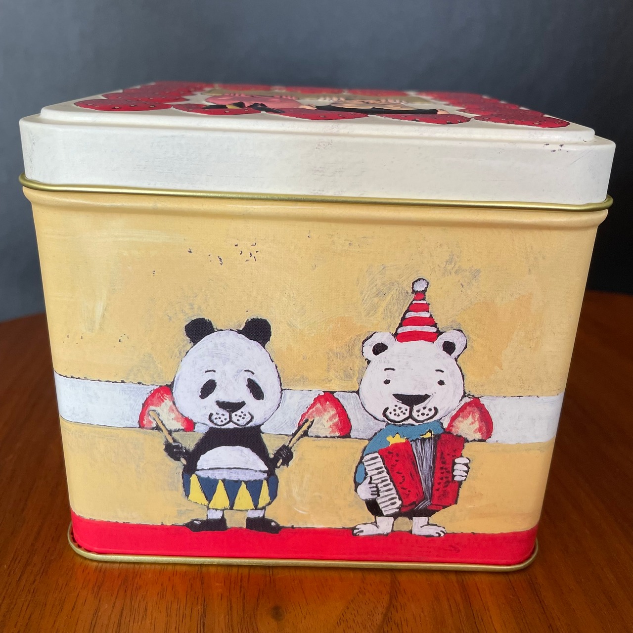 ふたの部分にはフランス語で「merci beaucoup」=「ありがとう」と書かれたプレートをサルさんとウサギさんが持っています。